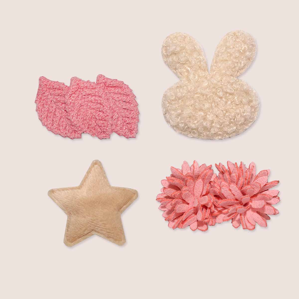A soft winter set with four hair clips in calm tones. Two beige clips with a bunny and a star, combined with two pink clips with a flower and leaves. Warm in color, soft in look and perfect for the colder months. They stay securely in fine baby hair and add that little extra to any winter outfit.